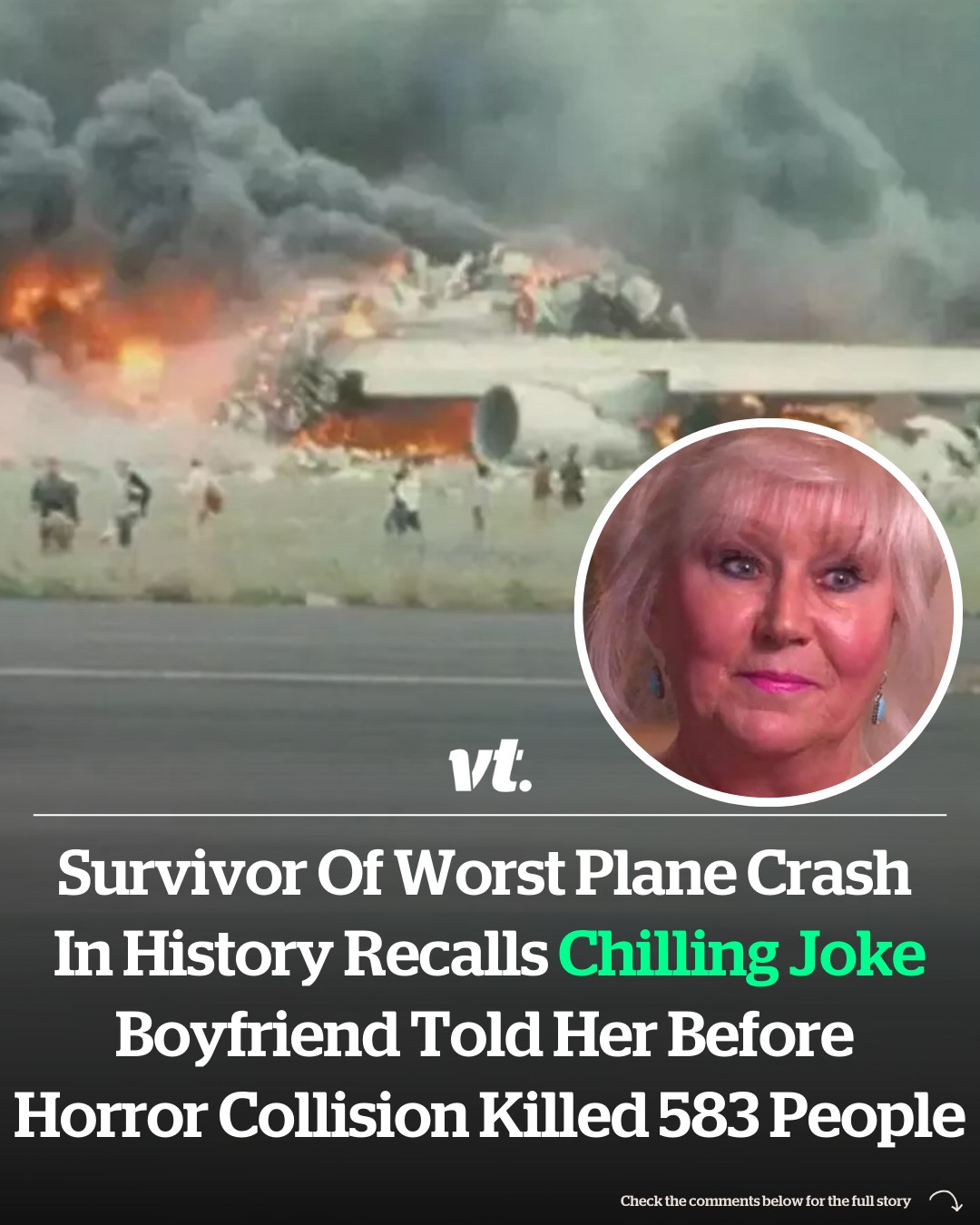 A woman who miraculously survived the deadliest plane crash in history revealed the ominous joke her boyfriend told her before disaster struck.