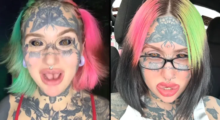 In addition to her tattoos and split tongue, she has veneers shaped like fangs and a heart-shaped implant in her hand.