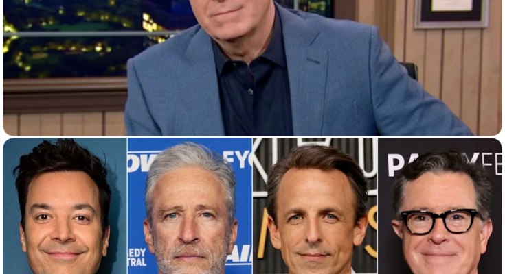 In the fiercely competitive world of late-night television, hosts are rivals, gladiators battling for ratings in the same time slot. They trade barbs, steal headlines, and carve out their own distinct territories in the cultural landscape. But on one remarkable night, the walls came down. In a powerful and unprecedented display of unity, the biggest names in the business—Jimmy Fallon, Seth Meyers, Jon Stewart, and John Oliver—put competition aside and appeared together on Stephen Colbert’s stage, not as rivals, but as friends. This was no ordinary guest spot; it was a silent, powerful protest and a show of solidarity following the stunning news that CBS was canceling The Late Show with Stephen Colbert.