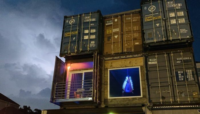The containers form a three-story structure with a roof terrace