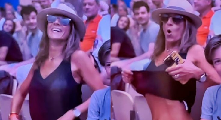 Cameras panned over to get some shots of the crowd during a small break, but they had no idea that the woman wearing a black low-cut shirt, tiny shorts, and a hat would leave viewers’ mouths on the ground with her actions.