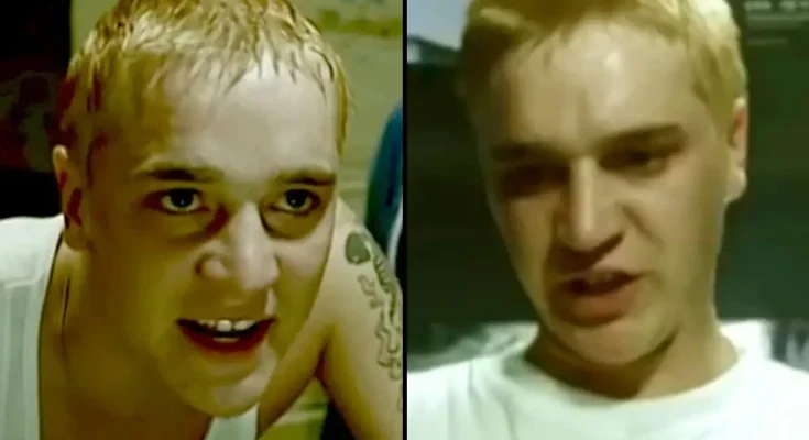 Throughout the music video, the fan copies all of the rapper’s iconic tendencies – wearing white vests, baggy blue jeans, and dying his hair icey blonde.