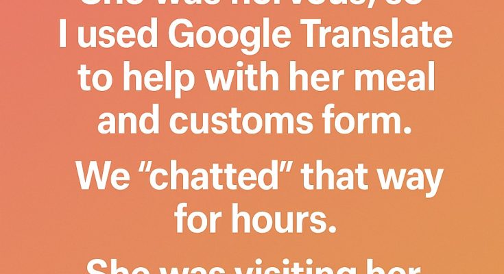 She looked nervous and a little overwhelmed, so I opened Google Translate and typed simple phrases to help her order her meal and fill out her customs form. Her eyes lit up with relief, and soon we were “chatting” back and forth, passing my phone between us.