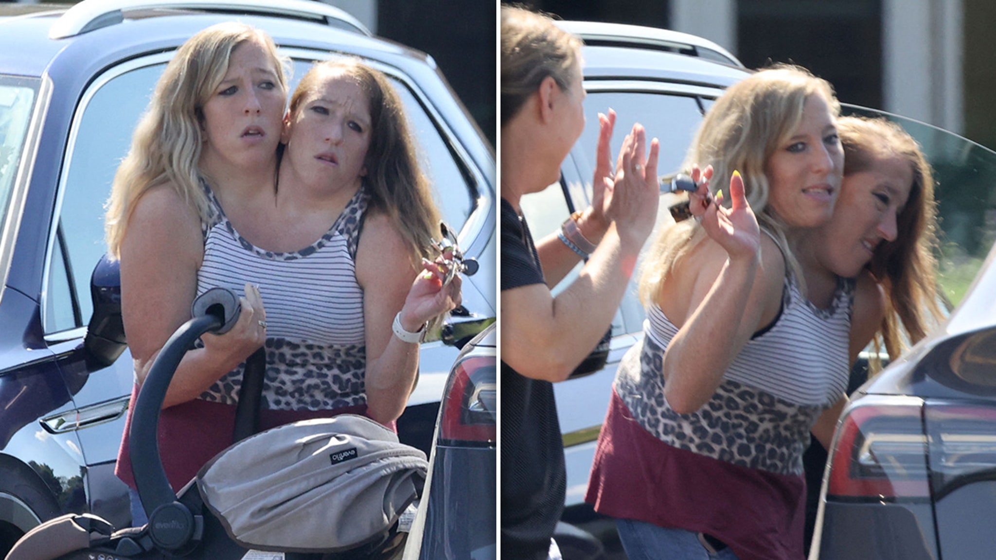 As mentioned … TMZ boke the story that the reality stars and famed conjoined twins were spotted in a parking lot in Arden Hills, MN — just northeast of Minneapolis — while they were putting a car-seated baby into a black Tesla.