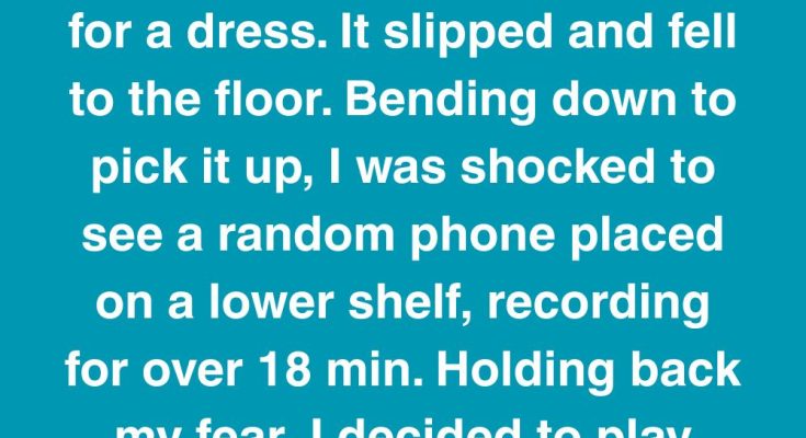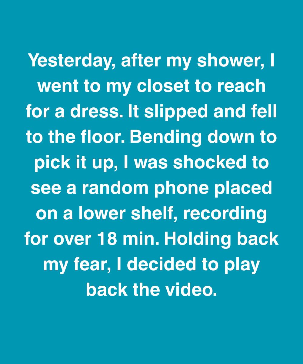 Yesterday, after my shower, I went to my closet to reach for a dress. It slipped and fell to the floor. Bending down to pick it up, I was shocked to see a random phone placed on a lower shelf, recording for over 18 min. Holding back my fear, I decided to play back the video.