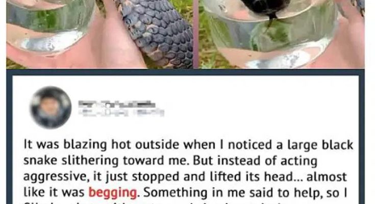 It was blazing hot outside as I noticed a large black snake slithering toward me. But instead of acting aggressive, it just stopped and lifted its head… almost like it was begging.