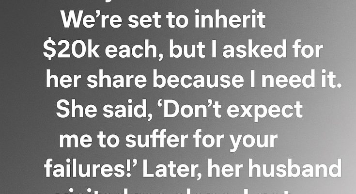 I’m a widow with three-year-old twins, struggling to make ends meet after losing my job. My sister, on the other hand, lives a life of luxury thanks to her wealthy husband.Recently, we learned we would each inherit $20,000 from a distant relative. Knowing how difficult my situation was, I asked my sister if she could give me her share so I could provide a stable future for my children.