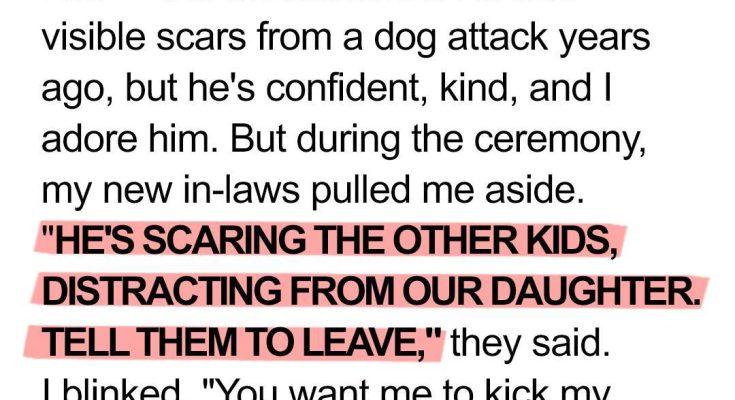 When Jack’s in-laws demanded he remove his nephew, Leo, from the wedding ceremony because of the boy’s scars, he was torn. But they didn’t expect what his bride, Emily, would do next.The chapel was filled with family and friends as Jack stood at the altar, his nine-year-old nephew proudly holding the rings beside him. Leo, who bore visible scars from an old accident, was excited to be part of the big day. His mom, Sophie, watched lovingly from the front row.