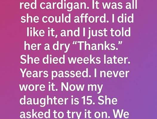 She slipped her arms through the sleeves and twirled in front of the mirror. The red popped against her dark hair, and for the first time in years, I saw the cardigan not as a burden—but as something alive again.