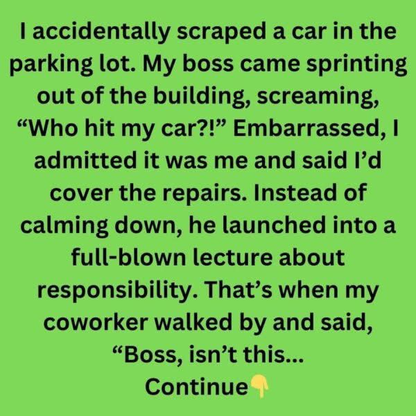 Instead of calming down, he launched into a full-blown lecture about responsibility.That’s when my coworker walked by and said, “Boss, isn’t this the company car you scratched last week?” My boss turned beet red, muttered something under his nose and stormed back inside.