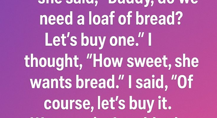 “Of course, sweetheart,” I replied. “Let’s go get one.”We walked inside, picked out a warm, fresh loaf, and headed to the counter. I paid for it, imagining how happy she’d be to have some bread with butter when we got home.As we stepped outside, she looked up at me with a big grin and said,“Great!