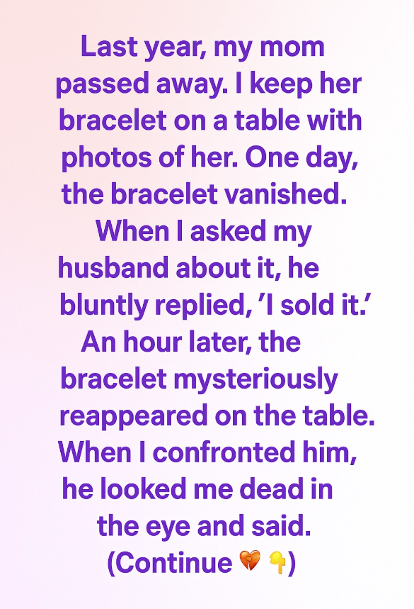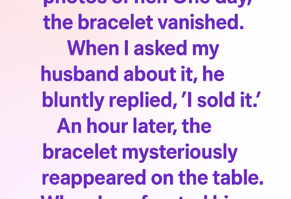 One morning, I noticed the bracelet was gone. My heart sank. I searched everywhere — under the table, in drawers, even inside the couch cushions — but it was nowhere to be found. Confused and upset, I asked my husband if he’d seen it. Without hesitation, he said, “I sold it,” and walked away. My chest tightened. I couldn’t believe he’d say something like that about something so precious. I felt hurt and betrayed.