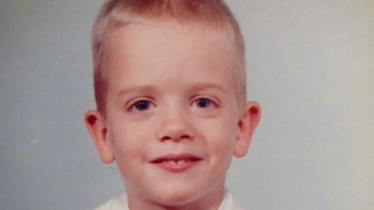 Look at this ordinary school photograph of a young boy with a bright smile, posing for what appears to be a typical class picture.