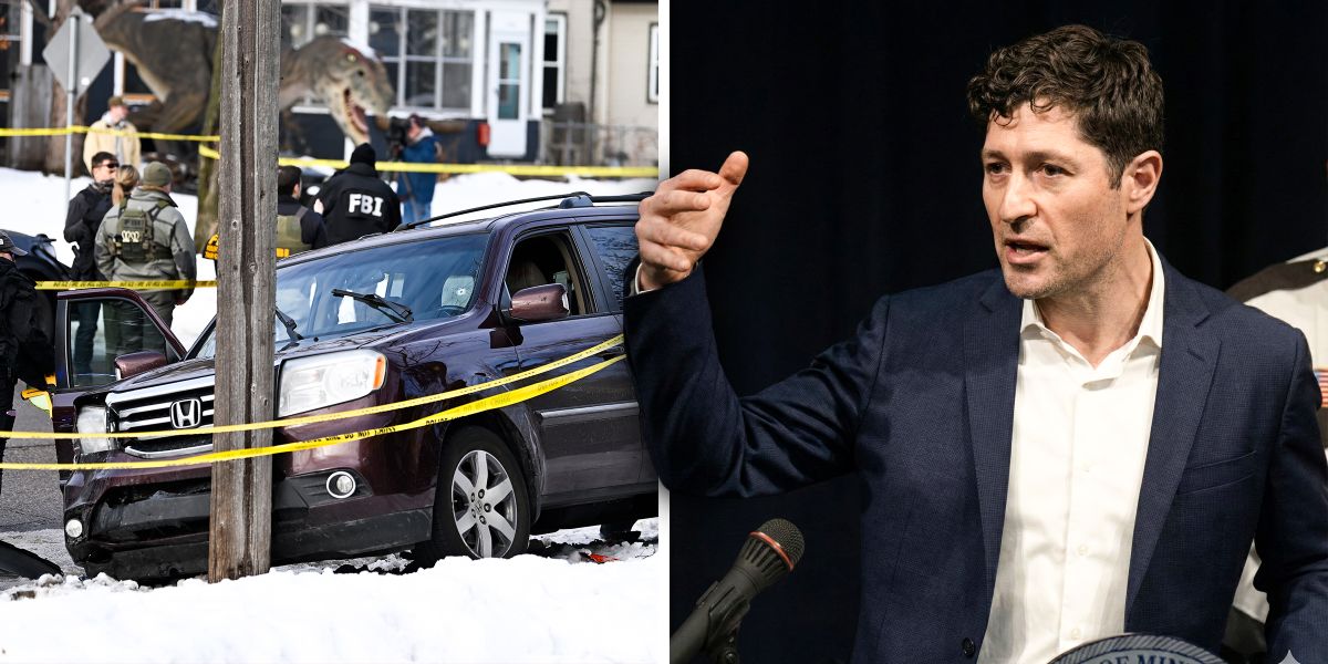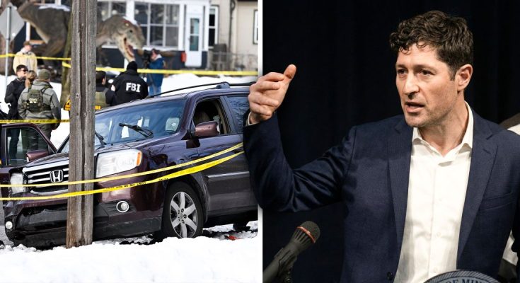 Law enforcement officers secure the scene | Minneapolis Mayor Jacob Frey | Source: Getty Images | Youtube/@FOX2Detroit
