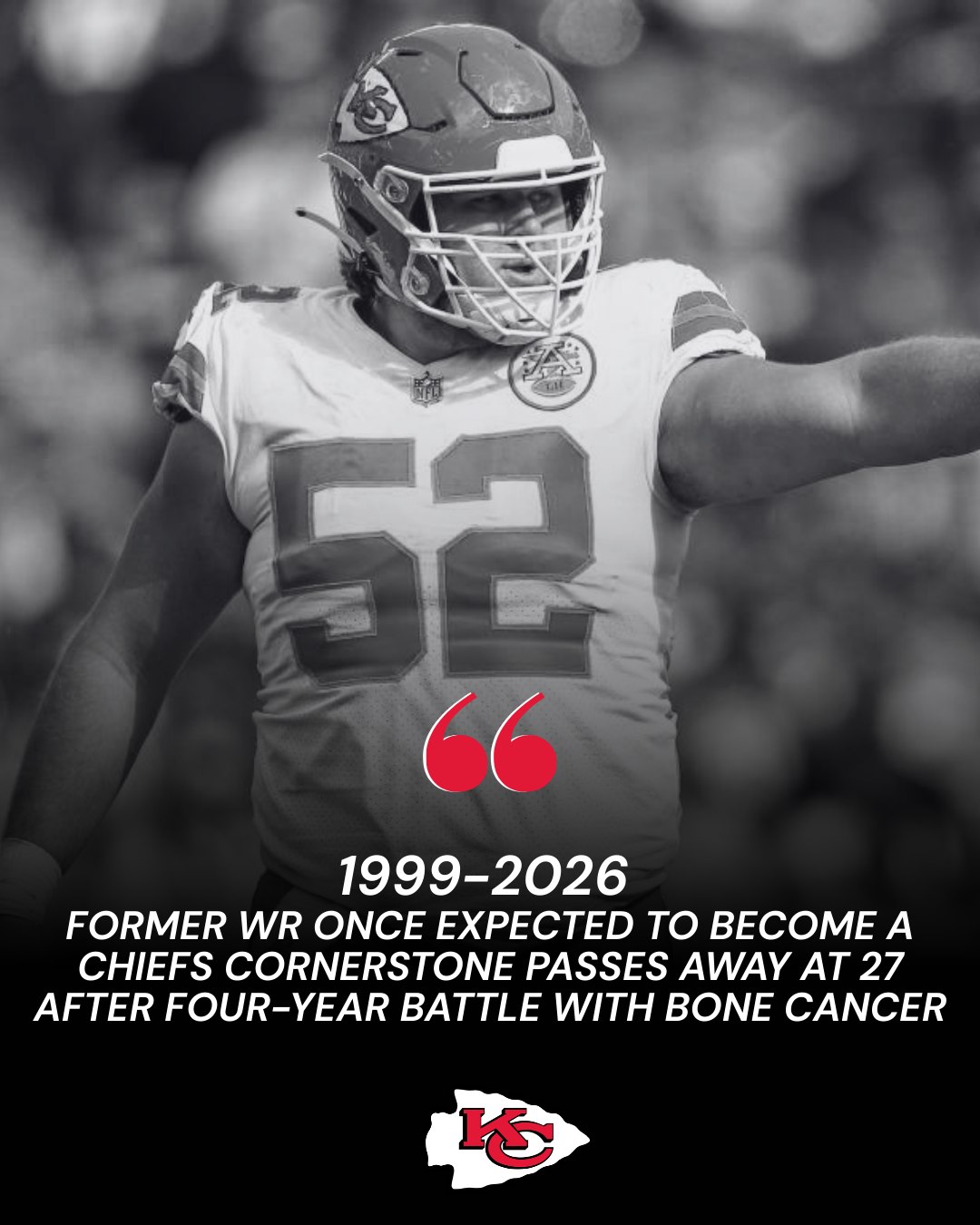 The Kansas City community woke up to devastating news that feels almost impossible to process. A wide receiver once projected to become a cornerstone of the Kansas City Chiefs has passed away at just 27 years old after a four-year battle with osteosarcoma, a rare and aggressive form of bone cancer that forced him to put his NFL dream on hold and ultimately transformed him into something even greater than a rising football star.