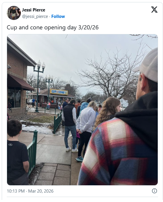 A post shared on X on March 20 shows a line of people gathered outside Cup and Cone for its seasonal opening. The image captures families waiting along the sidewalk, offering a glimpse into a calm, everyday moment.