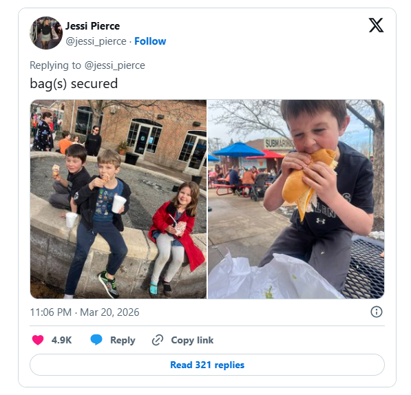 An additional update from the same platform shows three children sitting together outdoors, smiling and eating, while another image captures one of them taking a bite of a sandwich, highlighting a casual and joyful moment.