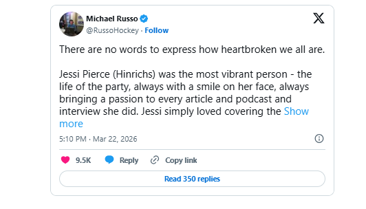 The tragedy has also been felt deeply within the hockey community. In a heartfelt message shared on X, hockey writer Michael Russo reflected on Pierce’s impact, describing her as a vibrant presence whose energy and passion touched everyone around her.