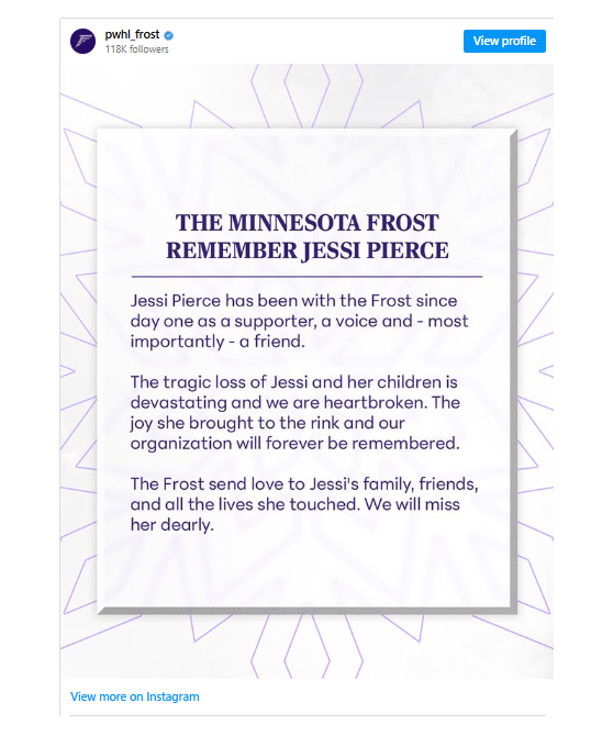 In a statement shared on X, the Minnesota Wild said, “We are heartbroken and join the State of Hockey in mourning the tragic loss of Jessi and her children. May they rest in peace.”